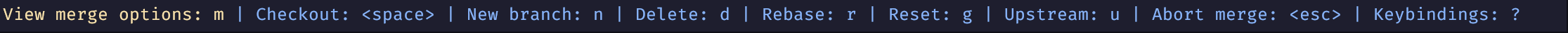 上面是 lazygit 的底部按键提示栏, 这其中可以看到, view merge options: m 即 m 是可以打开合并选项的快捷键