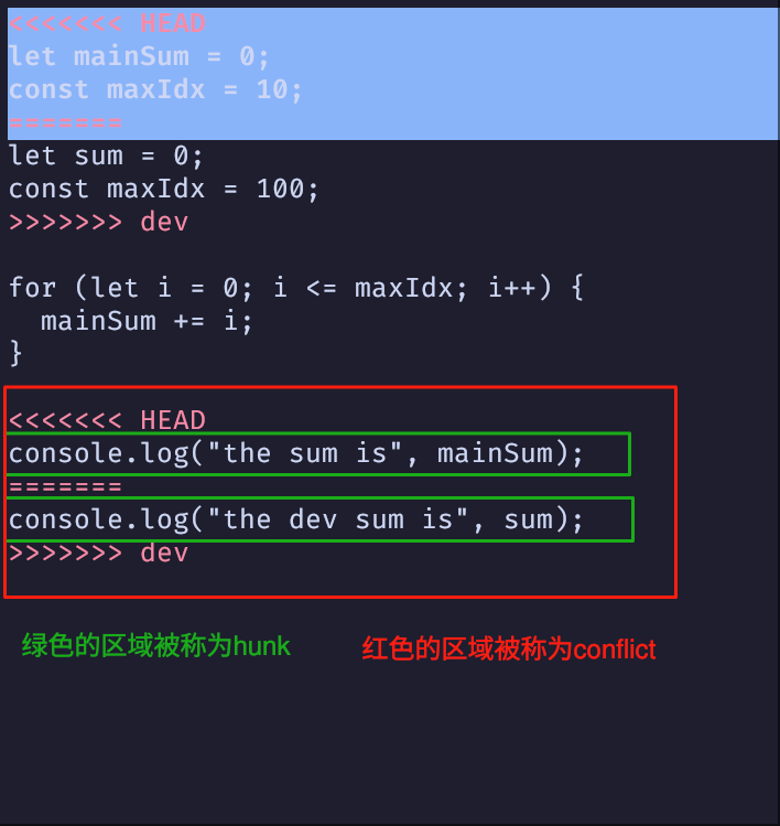 >>>>>>> dev可以看出, 要解决上面的冲突, 并不能简单的通过选择某一个 hunk 来解决, 所以, 在编辑器中解决冲突更加合适