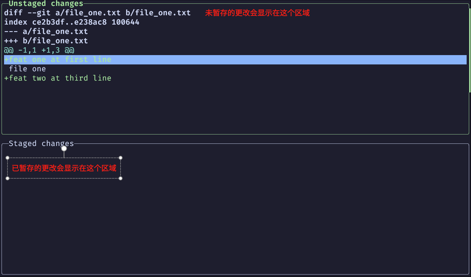这时, 我们只想暂存某个 feature(功能) 的 hunks, 例如, file_one.txt 文件中的两处更改对应的就是 feat one 和 feat two 两个 feature(功能)